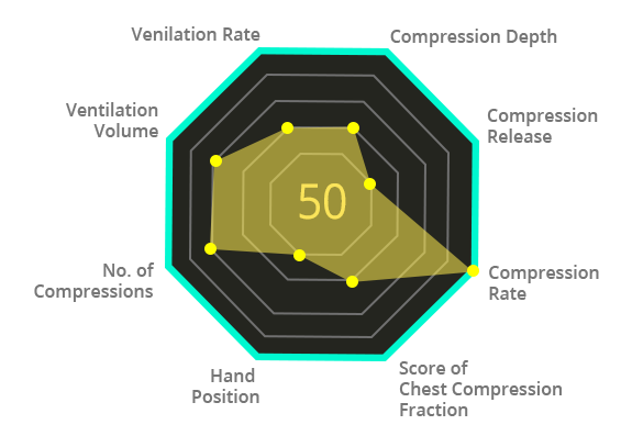 The initial feedback screen presents the overall score obtained for the CPR performed (according to the scoring algorithm). It highlights performance for 8 key CPR parameters and presents the data as a unique interactive ‘radar chart’.